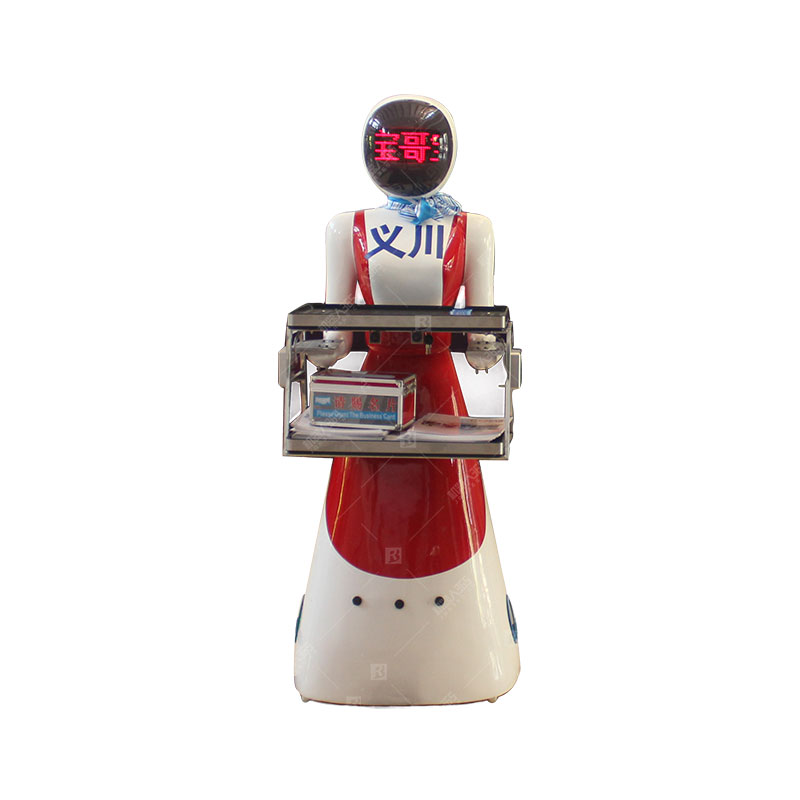 主要为蓝色白色或红色白色组成,可配带丝巾饰品。在送餐时时速约0.5米/秒,运行过程中碰到客人时主动停下让路。走到指定餐桌后会停下,旋转一定角度面向客人并播报菜名,当她感应到客人把菜取走时会在3秒后转身离开,送餐完成。自带避障装置,在运行时前方有障碍物机器人自动停止运行,并语音提醒前方人员让开。当前方障碍物消失以后,机器人继续送菜。语音提示内容:可由用户自行添加方言或特色语言,方便添加更改。