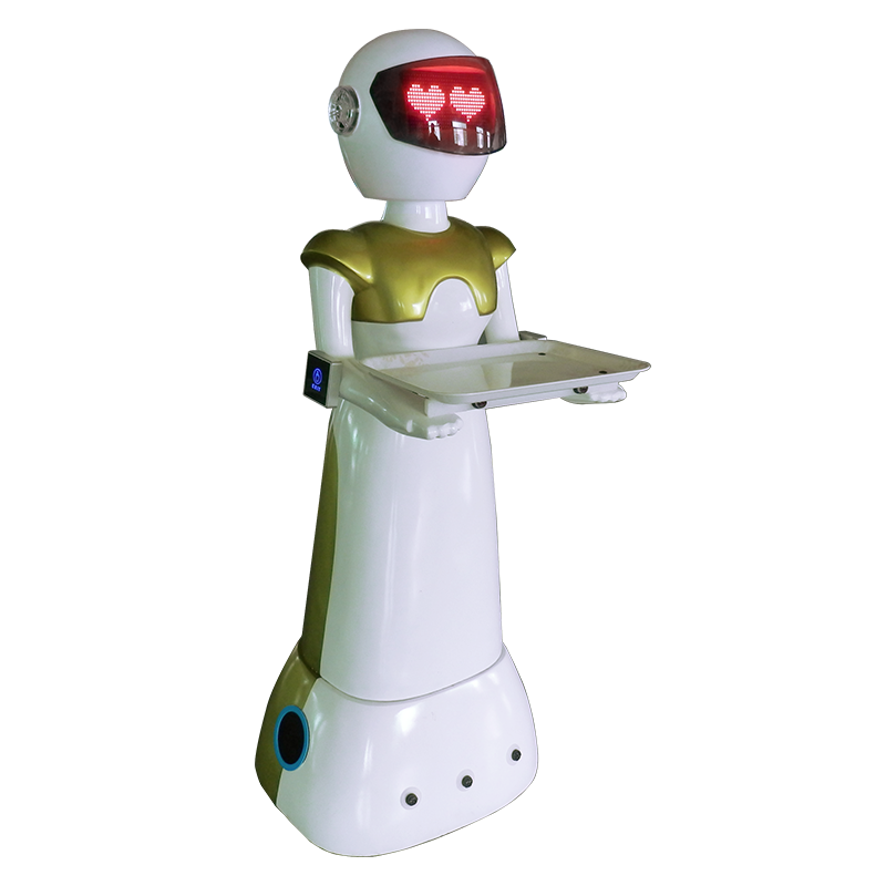 说 明:餐厅送餐机器人,利用磁条导航,集成点餐、语音、娱乐、送餐等功能,能够根据事先输入餐桌编码直接送到餐桌上。
